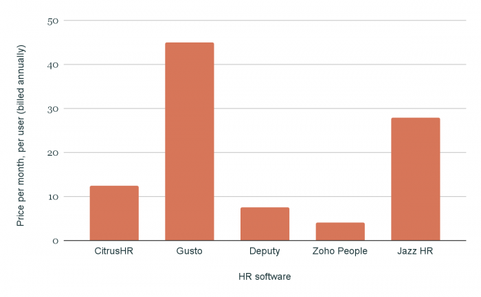 As expected, Zoho People scores highest on affordability, costing just £4.15 in total per month, for a team of five – although it should be noted that this is for the platform’s very basic Essential HR plan.